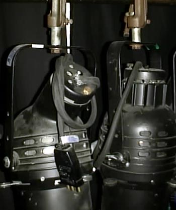 This is an Altman followspot. Please have at least two people to raise or lower this light on it’s stand. I’ve seen, too often, somebody trying to lower it and get their hand caught and pinched.